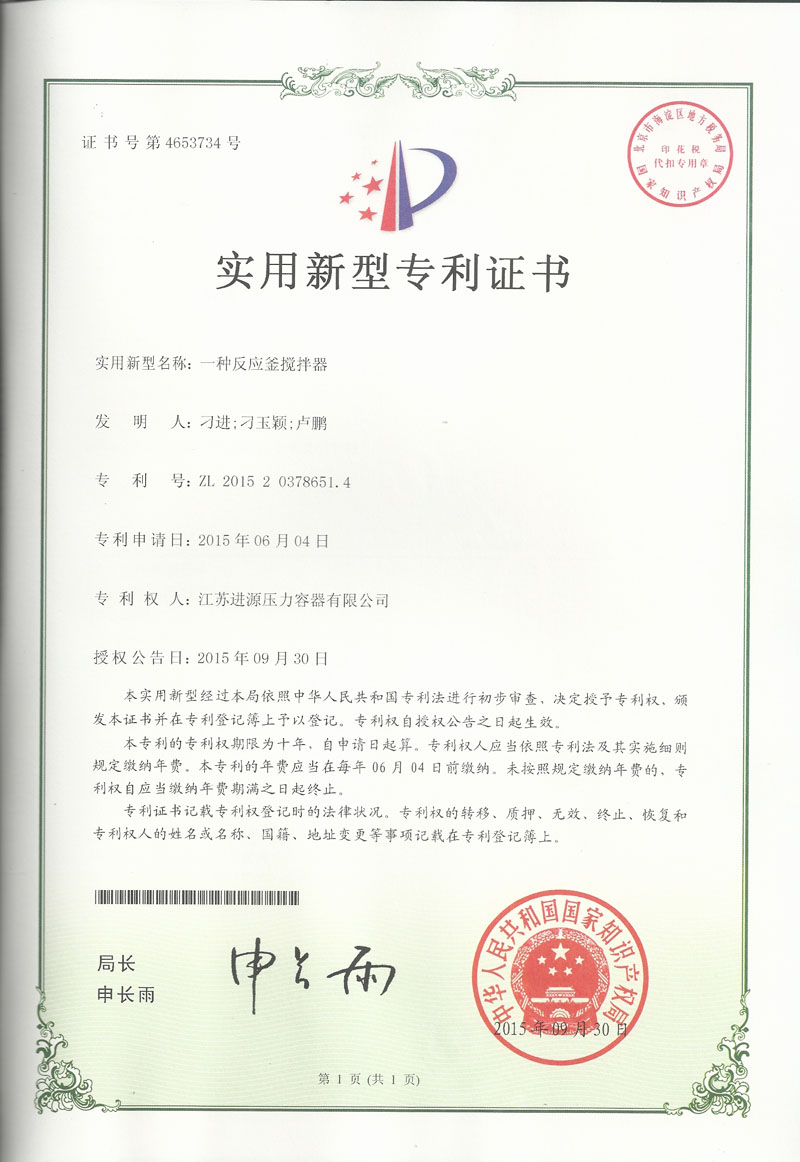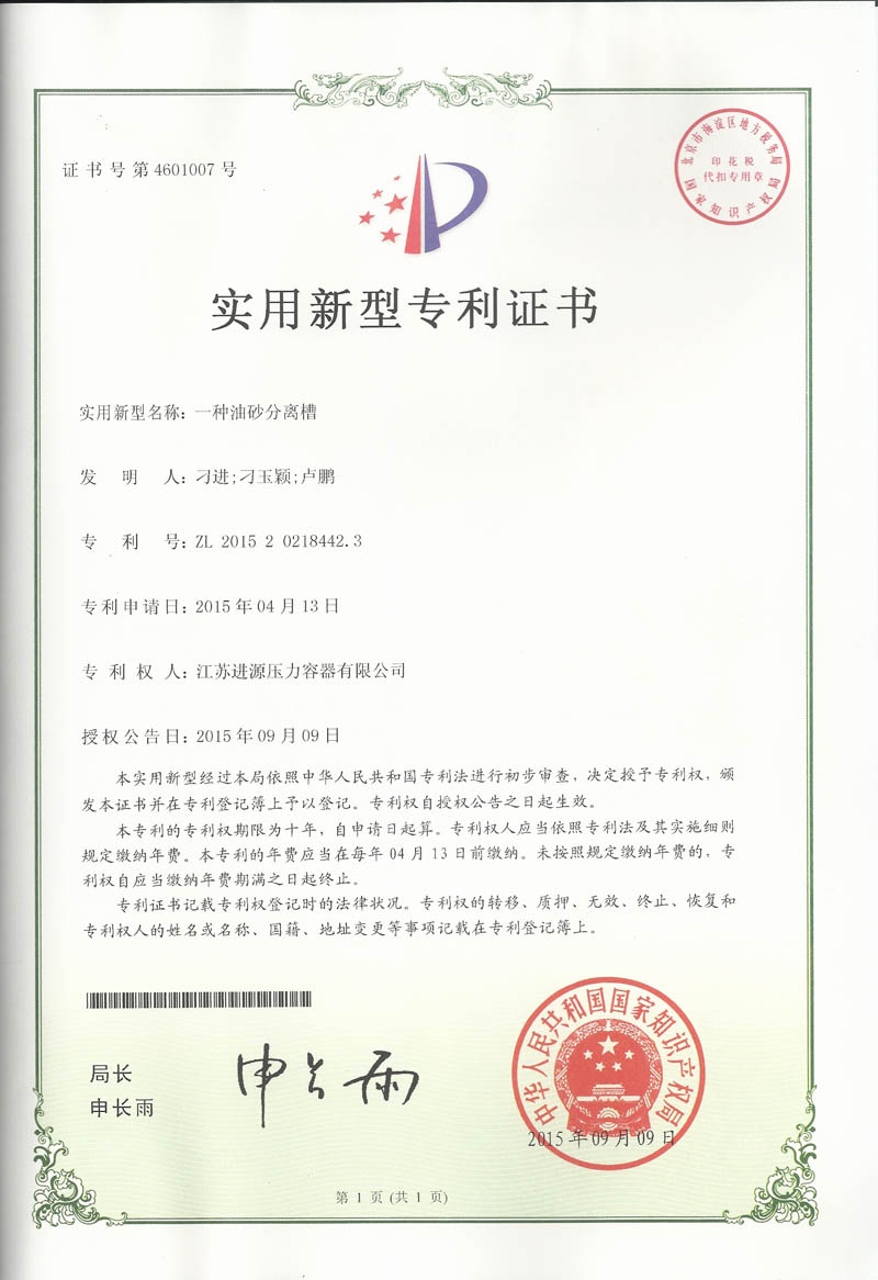 江蘇進源壓力容器有限公司自主研發(fā)的“一種油砂分離槽”、“一種反應釜攪拌器”、“螺旋板換熱器”、“一種高效節(jié)能蒸發(fā)式冷凝器”等四項創(chuàng)新成果,均獲得國家知識產(chǎn)權(quán)局專利授權(quán),專利期限為十年。另外申報的15項發(fā)明專利也被國家知識產(chǎn)權(quán)局受理。
